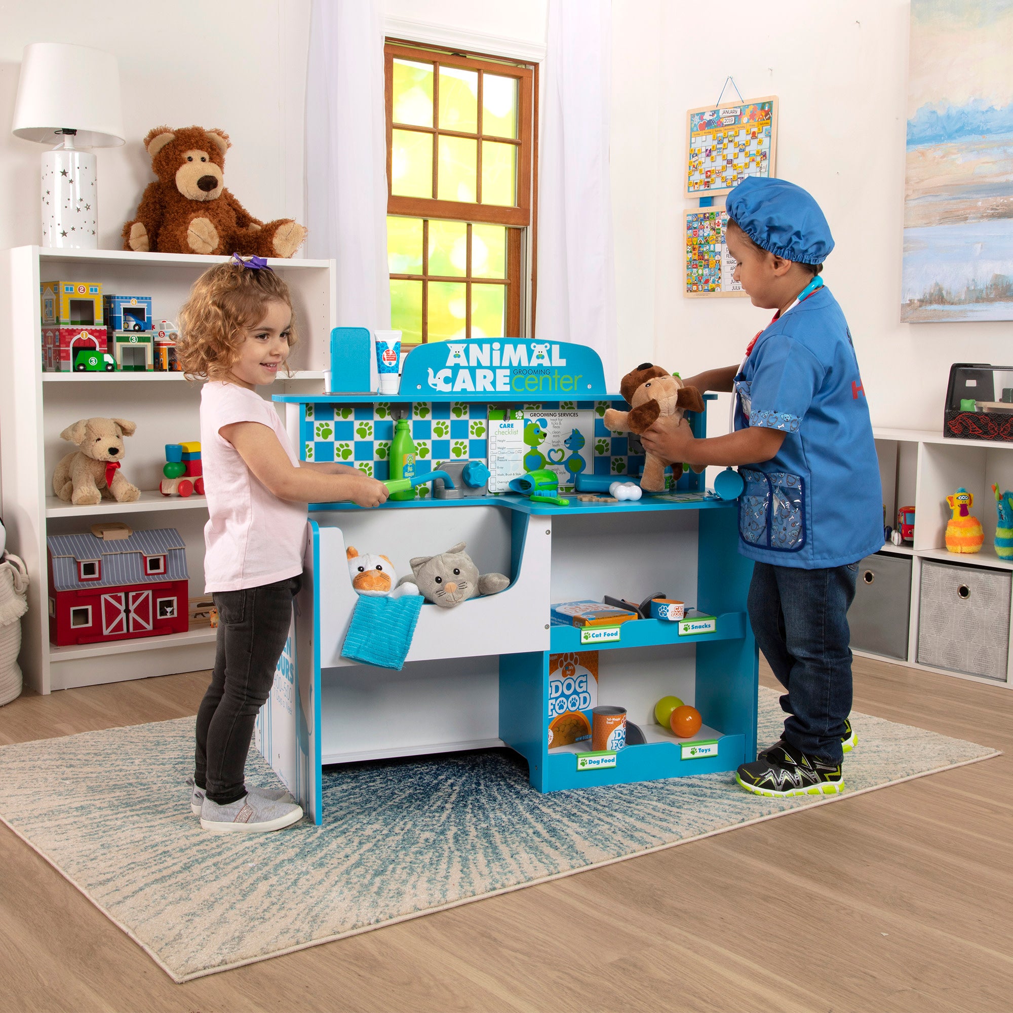 This is the perfect space for caring for furry friends! With a veterinarian side and a groomer side. plush pets (not included) can be examined. treated. and pampered for endless hours of imaginative fun. The sturdy wooden play center features an x-ray lens with two removable x-rays. pet scale. blood pressure monitor. sink. treat chute. pump bottle dispenser. and lots of storage. There are hooks and holders for lots of accessories. Detailed assembly instructions are included (assembles with just a Phillips head screwdriver. not included). Kids three and older will love having their very own space to nurture and care for their plush pals!