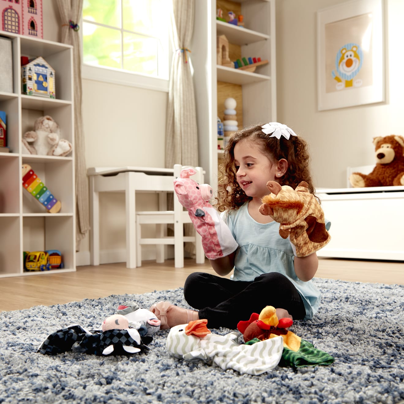 Kids two and older (and adults. too!) will go hog wild for this soft and cuddly deluxe farm animals hand-puppet set! The friendly cow. sheep. horse. duck. chicken. and pig make it easy for children and caregivers to role-play together. An insert in the package is designed to work as a puppet theater. The simple glove puppets help kids and adults act out scenes. practice new vocabulary. and spend quality time playing together. Great for motor skills and self-confidence. too! Made with brightly patterned. washable fabrics and built to last. these soft and sweet glove puppets fit kids and most adults and are sure to be go-to toys for years to come.