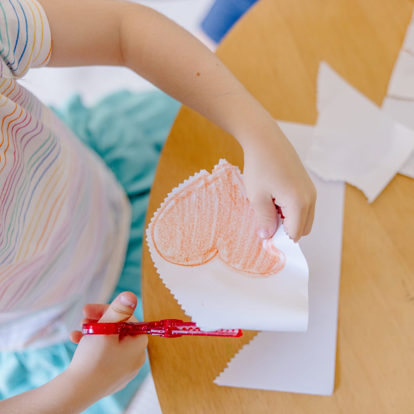 Two pairs of craft scissors safely cut paper in either straight or zigzag lines–for both lefties and righties! They won’t cut clothing or hair. Child-safe scissors are packaged in a plastic storage pouch for easy cleanup.