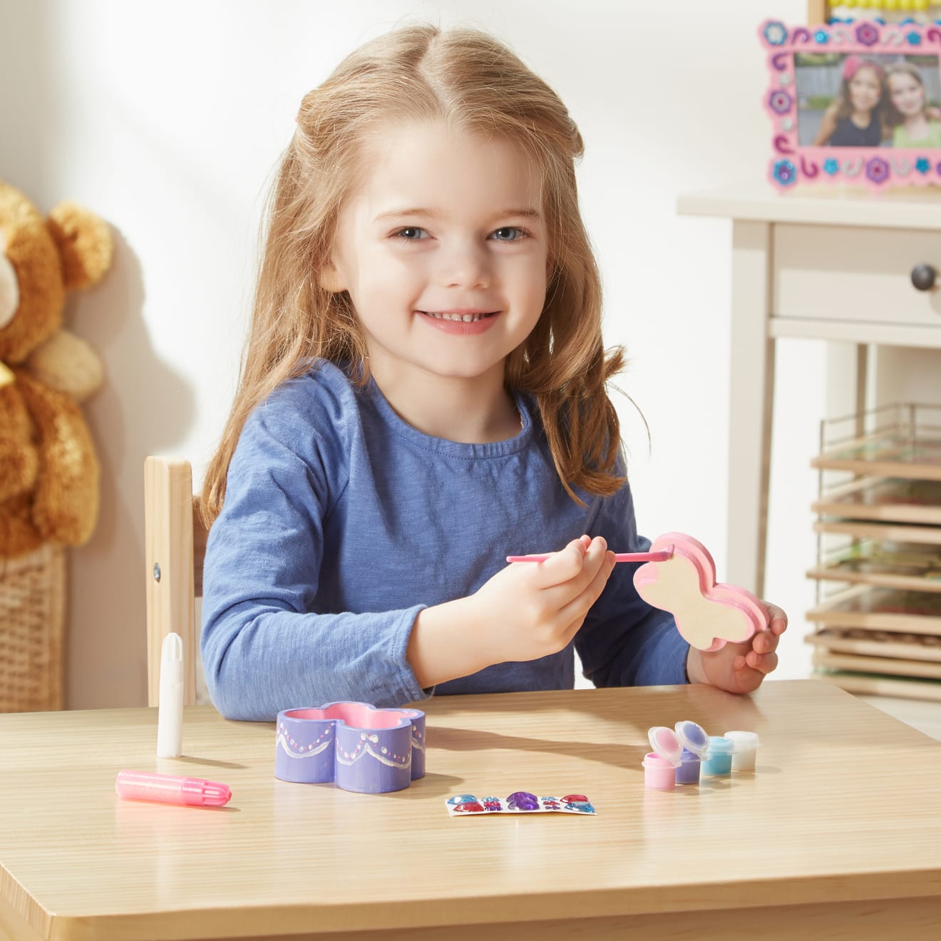 This special little box will glitter and flitter into children’s imagination! Includes a sturdy wooden butterfly-shaped box (3.1 x 1.4 x 2.6 in.). glitter glue. white glue. colorful gem stickers. 4 pots of paint. and a paintbrush. Add your unique personal touches to make an original craft inspired by you and your imagination! A perfect activity for parties or rainy days.