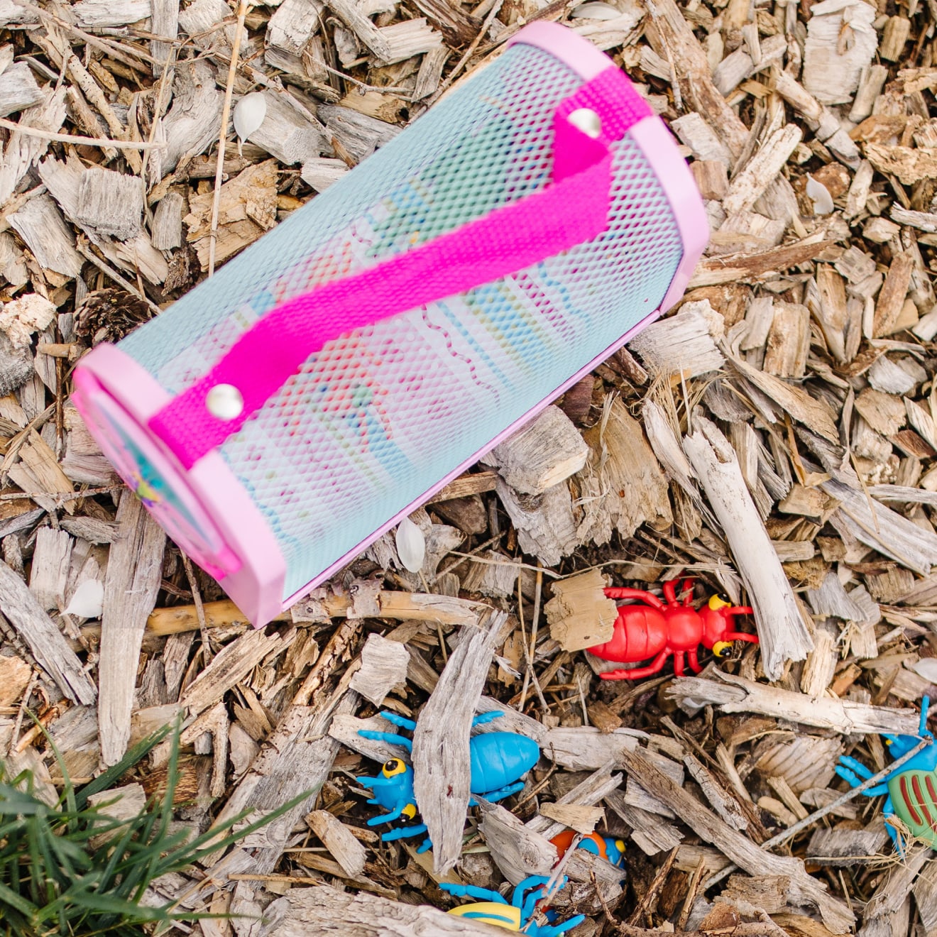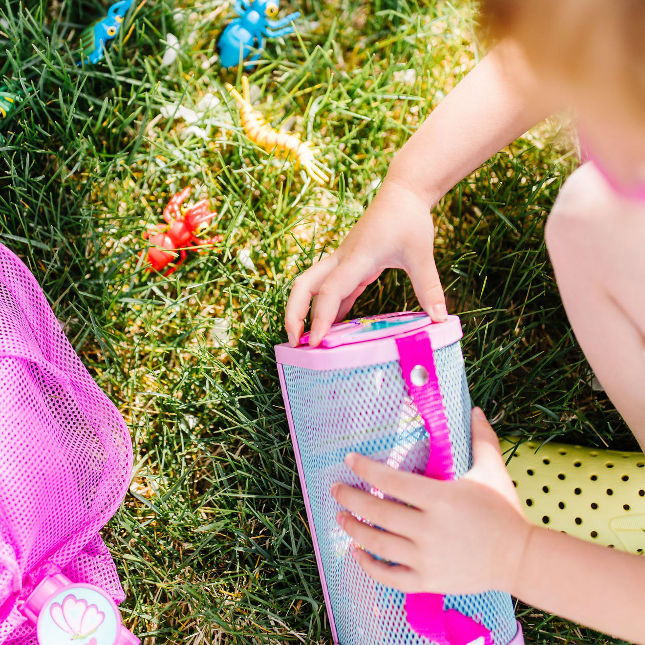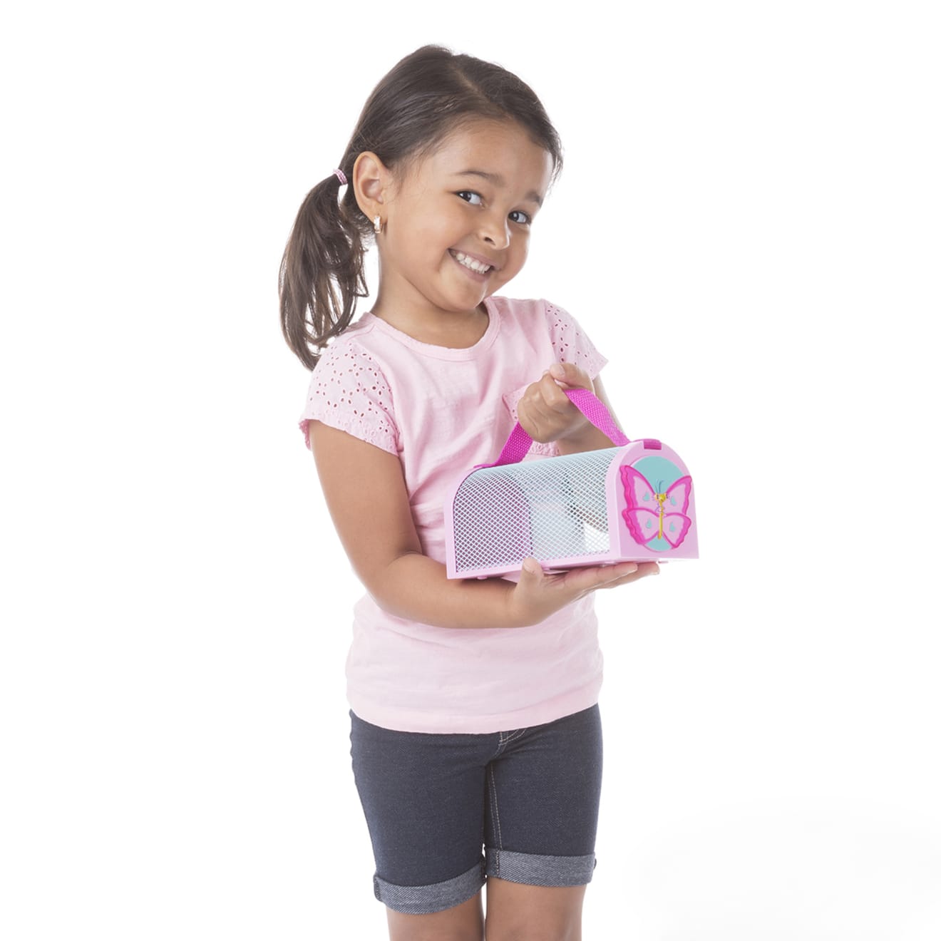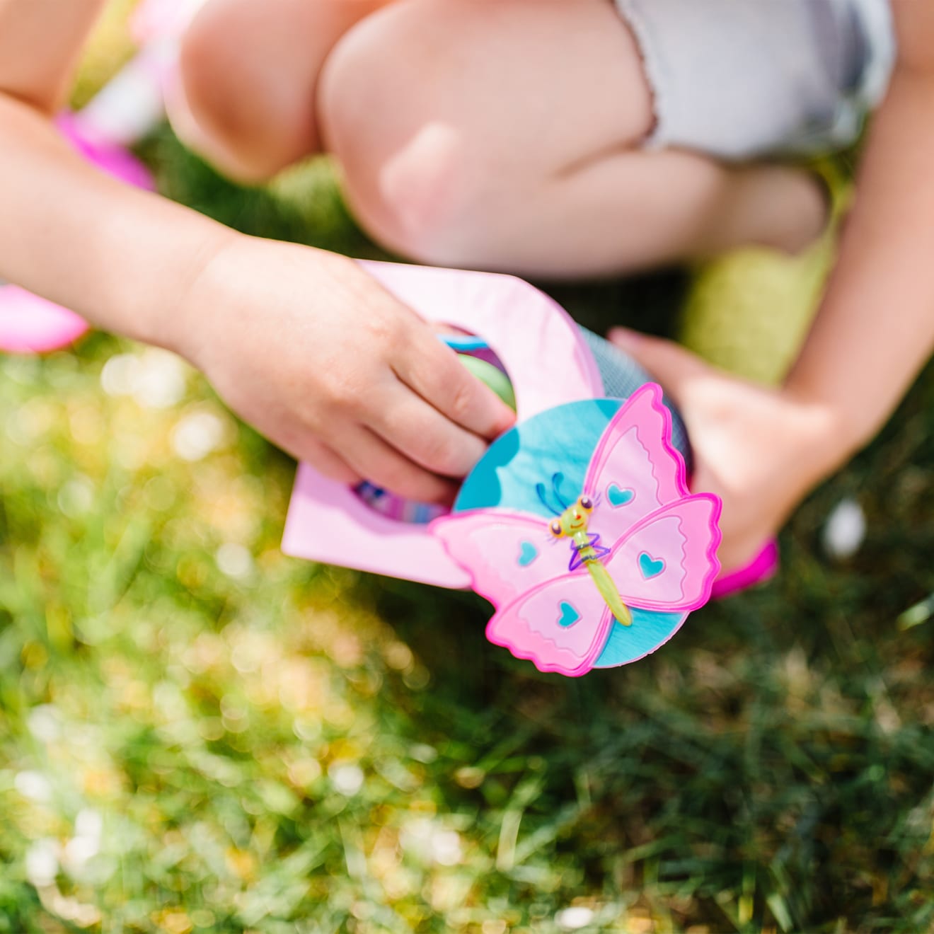 Cutie Pie Butterfly swings open on the easy-access door of this whimsical bug house. Made from lightweight molded plastic and wire mesh. it has a sturdy handle. a beautifully striped floor and lots of ventilation to provide the perfect place to house and observe insects and bugs. The Cutie Pie Butterfly Bug House is designed to encourage kids three and older and families to find new and enjoyable ways to explore their world together.