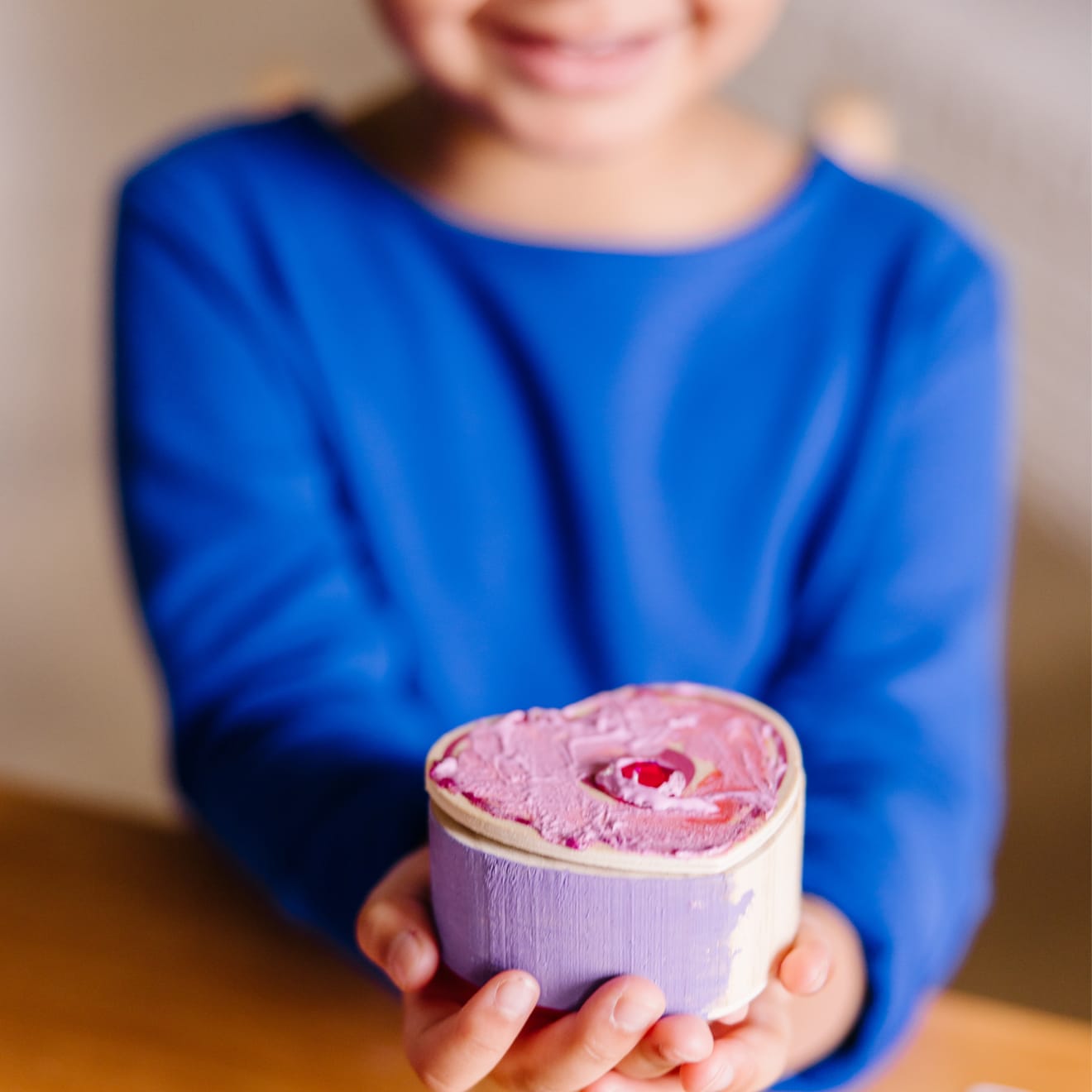 Looking for the perfect spot for storing special treasures? This kit includes a heart-shaped wooden keepsake box (3.25 x 2.75 x 1.5). glitter and craft glue. colorful gems. 4 pots of paint and a brush! A perfect activity for parties or rainy days.