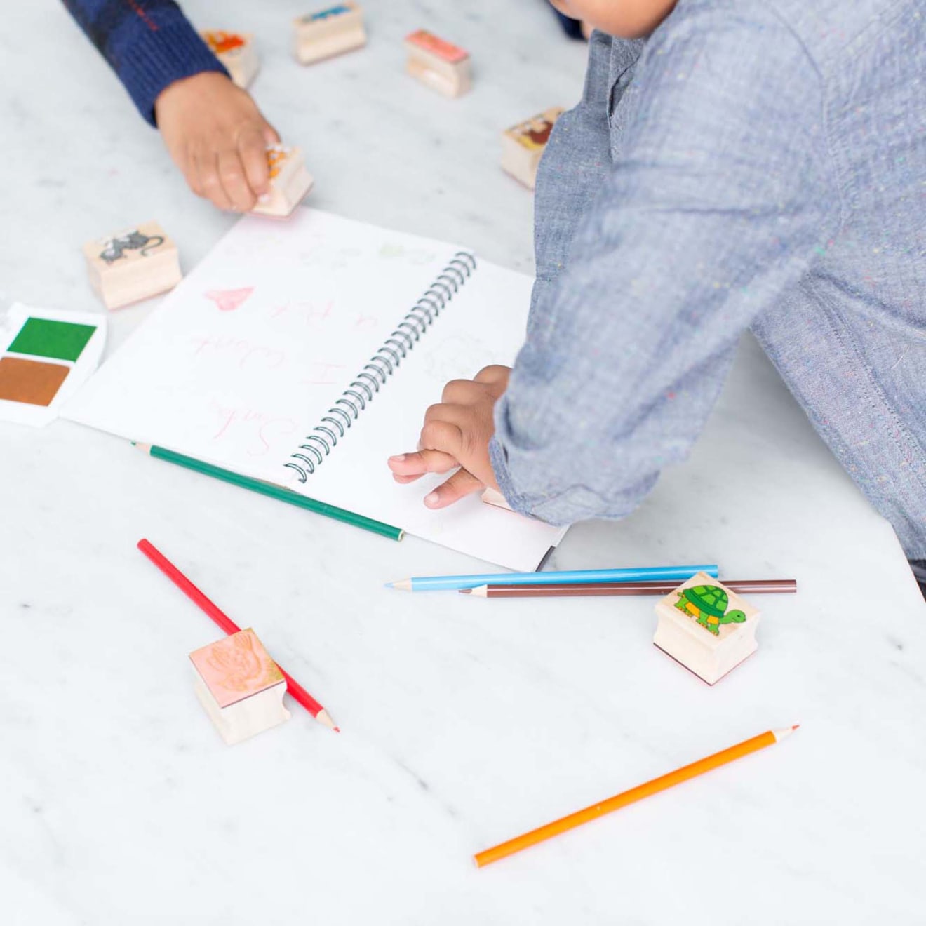 Create colorful scenes filled with adorable and exciting animal adventures with this 38-piece deluxe wooden animal stamp set! Choose from four colors of washable ink (red/blue and green/brown) to stamp animals. then color in and add details with six vibrant markers. Stamps include farm animals. ocean creatures. safari animals. and pets. With an abundance of animals to choose from. this set is perfect for creating art projects. cards. decorating notebooks. and more. All materials store neatly in a wooden crate. Wooden stamps help kids four and older develop hand-eye coordination and encourage storytelling and imaginative play.