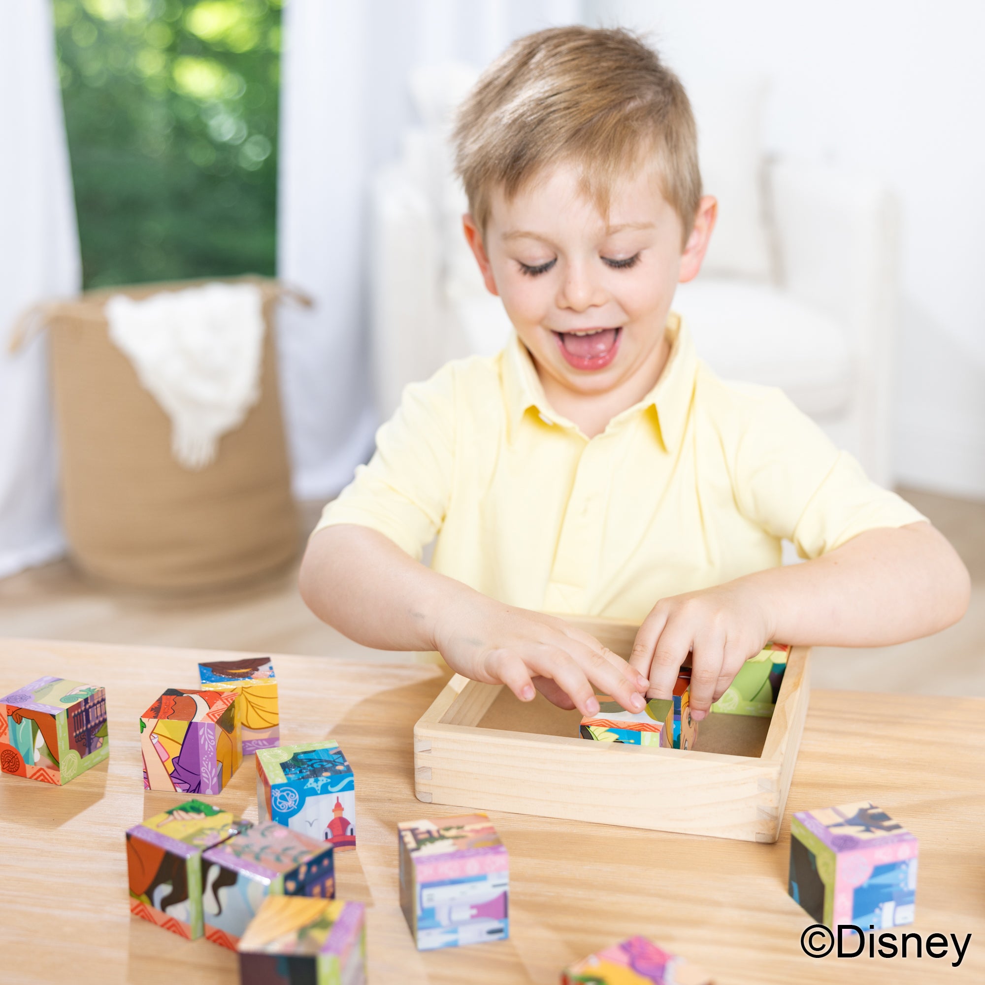 Piece together six different Disney Princess scenes with 16 solid wood blocks that store in a sturdy wooden tray for quick and easy cleanup! This Melissa & Doug wooden puzzle and wooden block building toy is sure to delight Disney fans three and older. Use the border designs as visual clues to piece together scenes with Moana. Ariel from The Little Mermaid. Tiana from The Princess and the Frog. Belle from Beauty and the Beast. Cinderella. and Rapunzel. Or. use the pieces for block play — stack. build. and knock down! Puzzle play is an engaging. hands-on way to encourage developmental skills. such as fine motor. problem-solving. sorting. stacking. and counting. and a great way to boost self-esteem! This product is certified by the Forest Stewardship Council. FSC certification ensures that products come from responsibly managed forests that provide environmental. social. and economic benefits. and that forests are protected for future generations. Please note that FSC certification applies to new inventory only (FSC C156584)