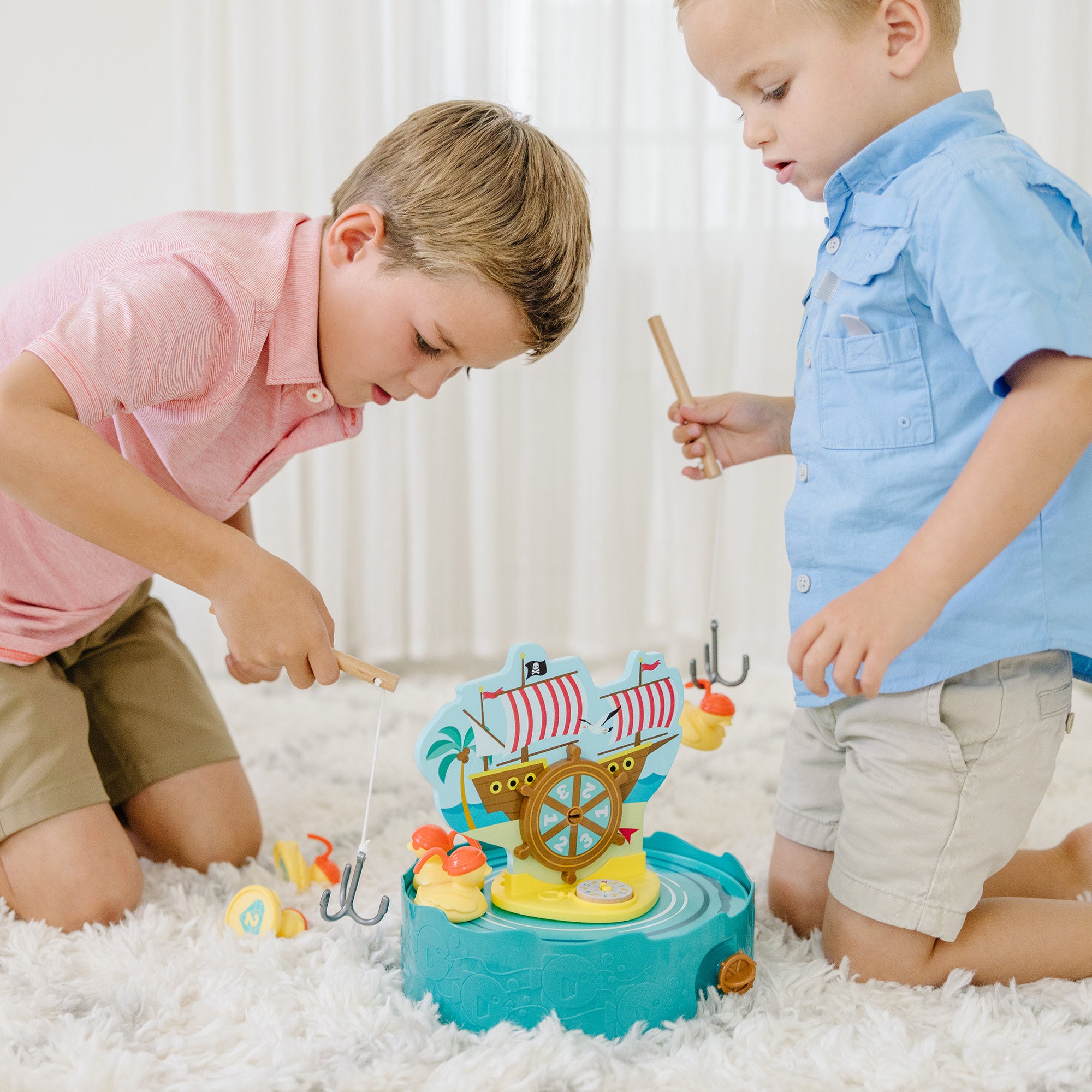 Step right up and turn any day into Fair Day! Melissa & Doug Fun at the Fair!? Hook a Duck lets kids three and older experience the excitement of the classic fairground fishing game at home! Start playing by inserting the secret-reveal player card ticket in the base to reveal a secret picture. Wind the pirate ship wheel to make the base spin (no batteries required!) and set the rubber ducks in motion. Use the wooden fishing rods to try your luck hooking a duck! Numbers and shapes on the bottom of the ducks allow for lots of matching. counting. or point-earning games. Fun for independent play. cooperative play. or challenge a friend. Designed to amuse. surprise. and challenge kids three and older to keep them laughing and learning through play. Hook a Duck is an engaging. hands-on way to encourage counting. matching. and fine motor skills. From games of skill and chance to innovative carnival-inspired play sets. the Melissa & Doug Fun at the Fair!? collection brings home all the fun of a day at the fair!