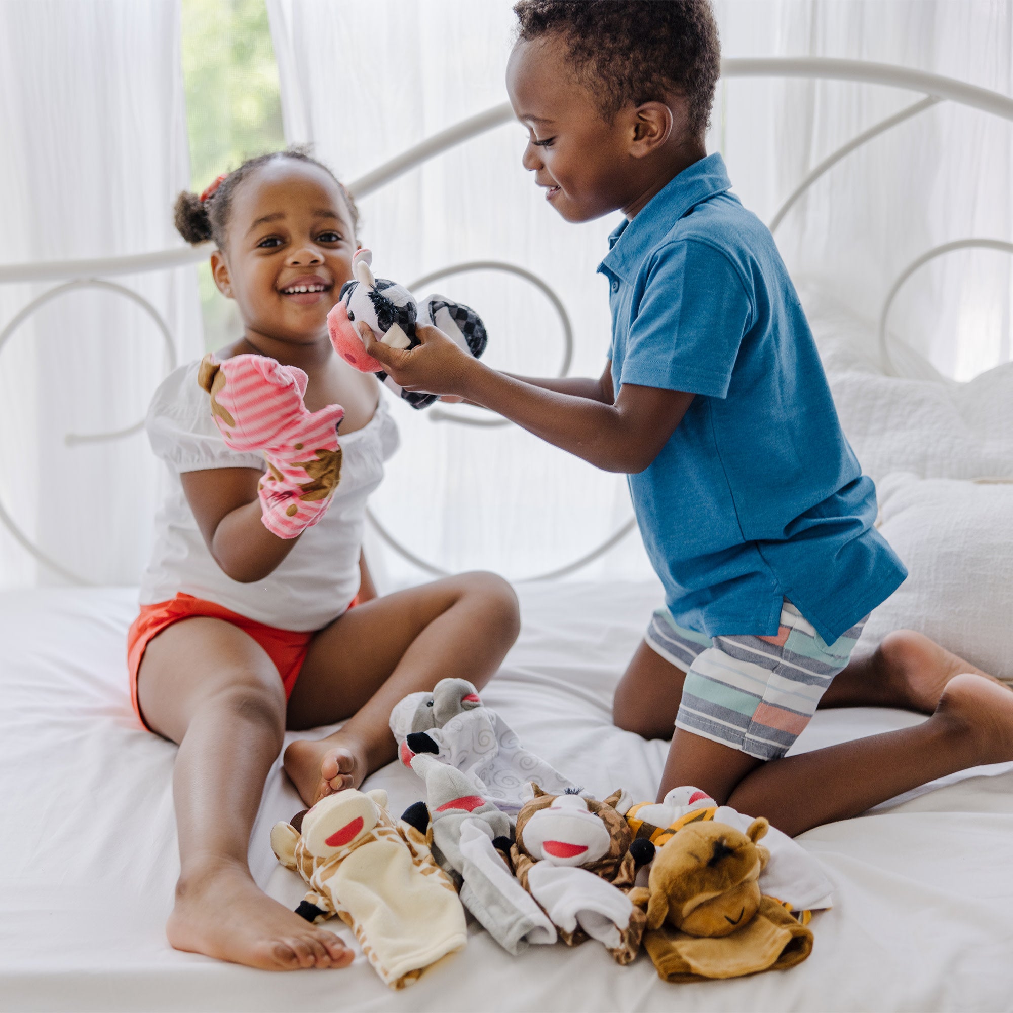 Two four-piece hand-puppet sets featuring friendly animals make it easy for children and caregivers to role-play together! Each set includes four simple glove puppets in coordinated themes (Farm Friends and Zoo Friends). Hand puppets are great for developing motor skills. hand-eye coordination. communication skills. self-confidence. parent-child bonding. and so much more! Made with brightly patterned. washable fabrics and built to last. these soft and sweet hand puppets are sure to be go-to toys for years to come. Farm Friends includes a sheep. cow. pig. and horse; Zoo Friends includes a tiger. monkey. elephant. and giraffe.