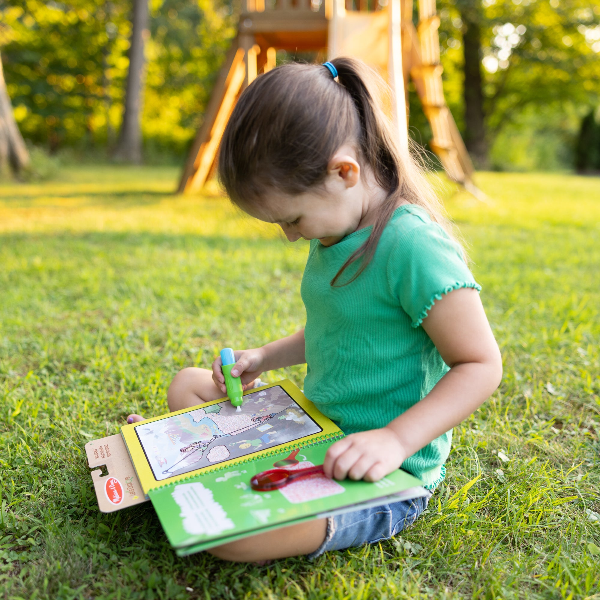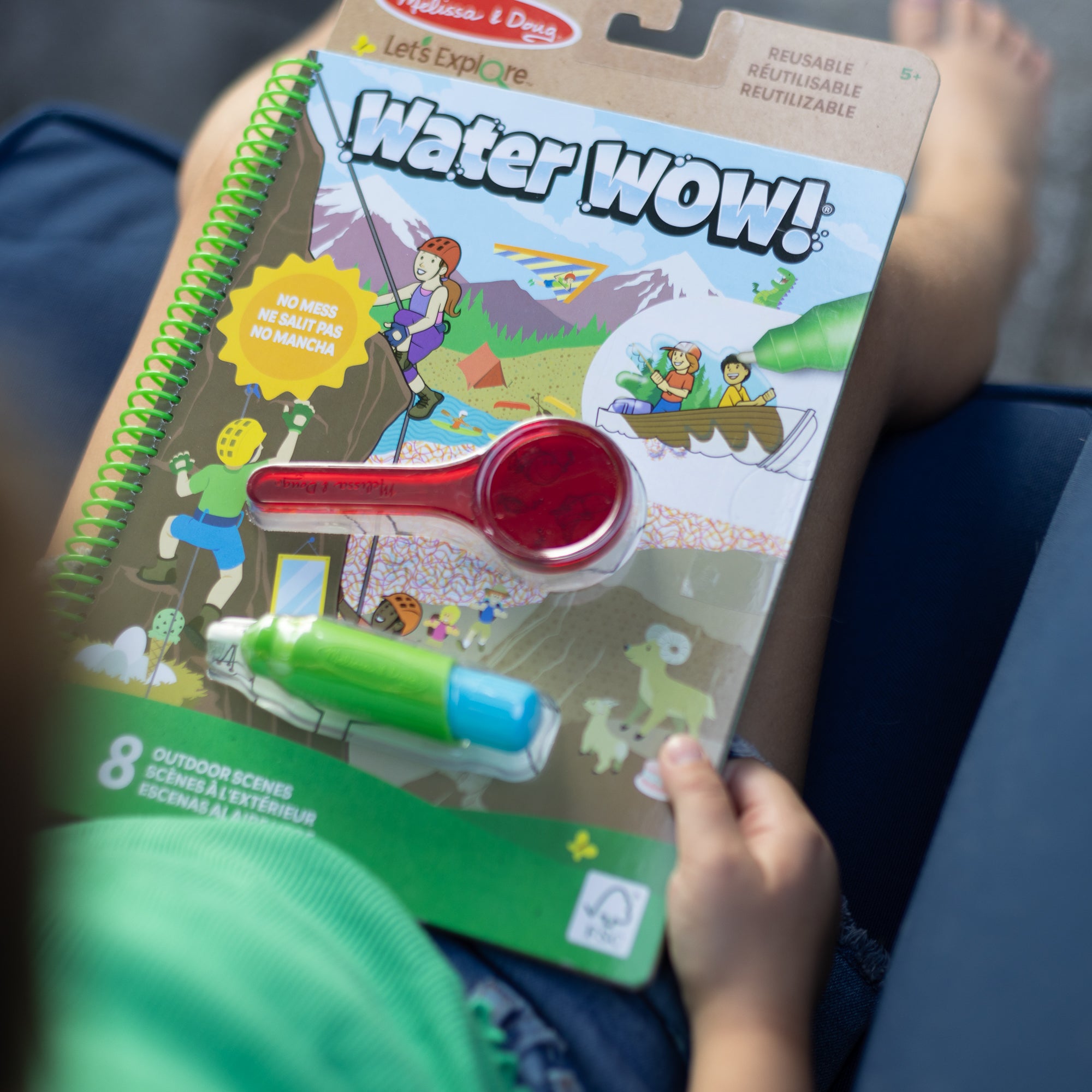Explore outdoor scenes and adventures with the Melissa & Doug Let’s Explore? Water Wow! Outdoor Adventure Deluxe Water Reveal Pad! The exciting no-mess paint-with-water activity for kids five and older includes eight spiral-bound reusable pages (rafting. forest maze. camping. underwater. ranch maze. mountain climbing. fishing. hiking trail). a refillable water pen. and a red lens to find hidden pictures. including silly seek-and-find on every scene. Simply use the pen to color in each scene and details and vibrant color appear with every stroke! Use the red lens to discover even more. Then. let the page dry to erase the pictures and color it in again and again. The chunky water pen and red lens store in the cover for easy portability. Let’s Explore? encourages kids four and older to connect with the natural world through imaginative play. Discover the joy of outdoor adventures that instill curiosity and confidence while inspiring kids to say. Let’s Explore?!