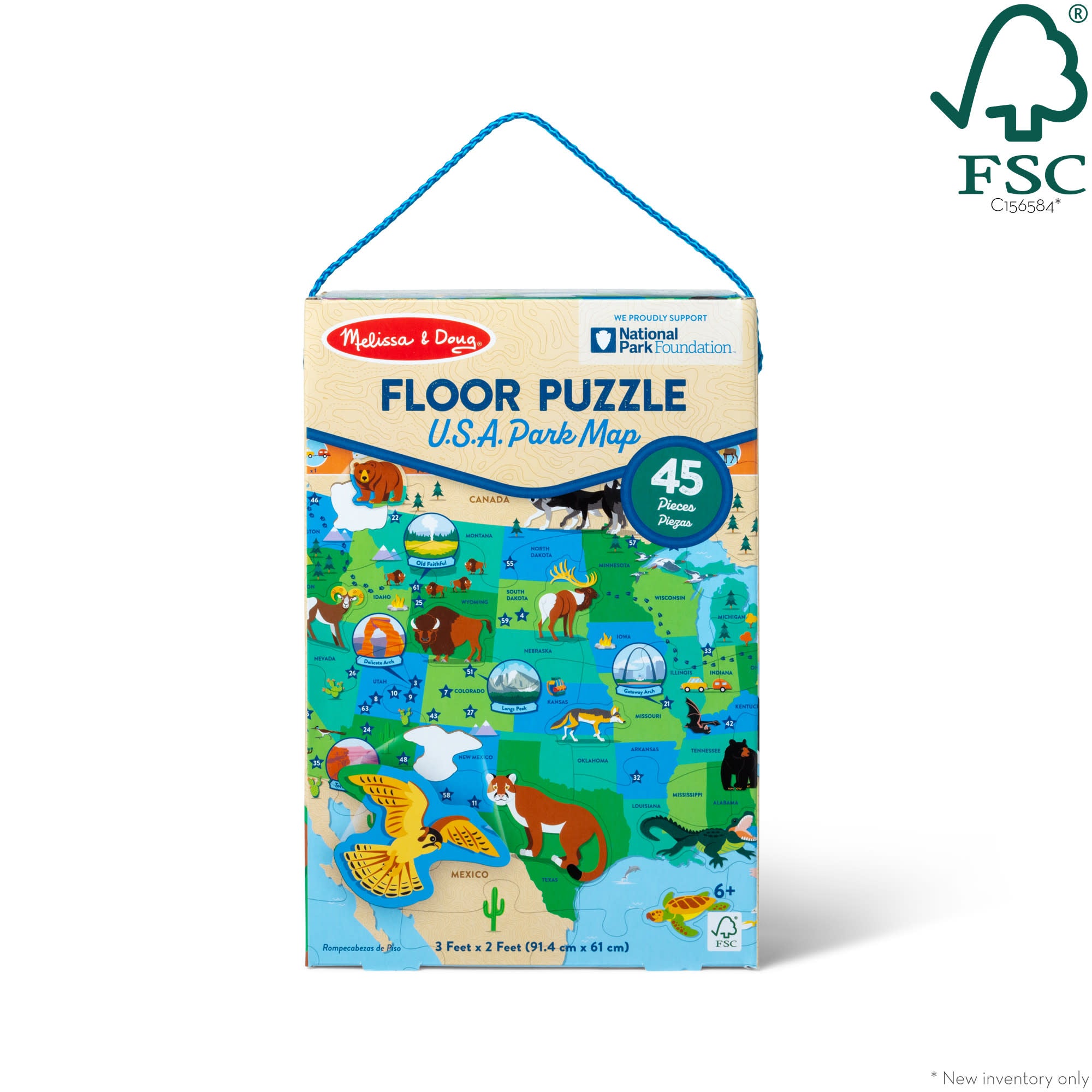Take an imaginative journey across the U.S.A. and learn about 63 national parks through puzzle play! Piece together the 45-piece jumbo cardboard jigsaw puzzle. featuring special animal-shaped pieces. search-and-find activities. and animal track identification along the border. Designed to make learning fun. states and points of interest are labeled. and a key inside includes an animal ID guide. park identification. and the search-and-find answers in English and Spanish! Completed puzzle is approximately 3 feet by 2 feet (91.4 cm x 61 cm). Puzzle play encourages fine motor and problem-solving skills and promotes concentration. memory. and independent learning. Melissa & Doug? is proud to support the National Park Foundation with a million-dollar minimum donation over three years. The Melissa & Doug? National Park Foundation collection is designed to inspire kids to discover the wonder of America’s national parks. Together. we’re helping protect our parks for present and future generations! This product is certified by the Forest Stewardship Council. FSC certification ensures that products come from responsibly managed forests that provide environmental. social. and economic benefits. and that forests are protected for future generations. Please note that FSC certification applies to new inventory only (FSC C156584)
