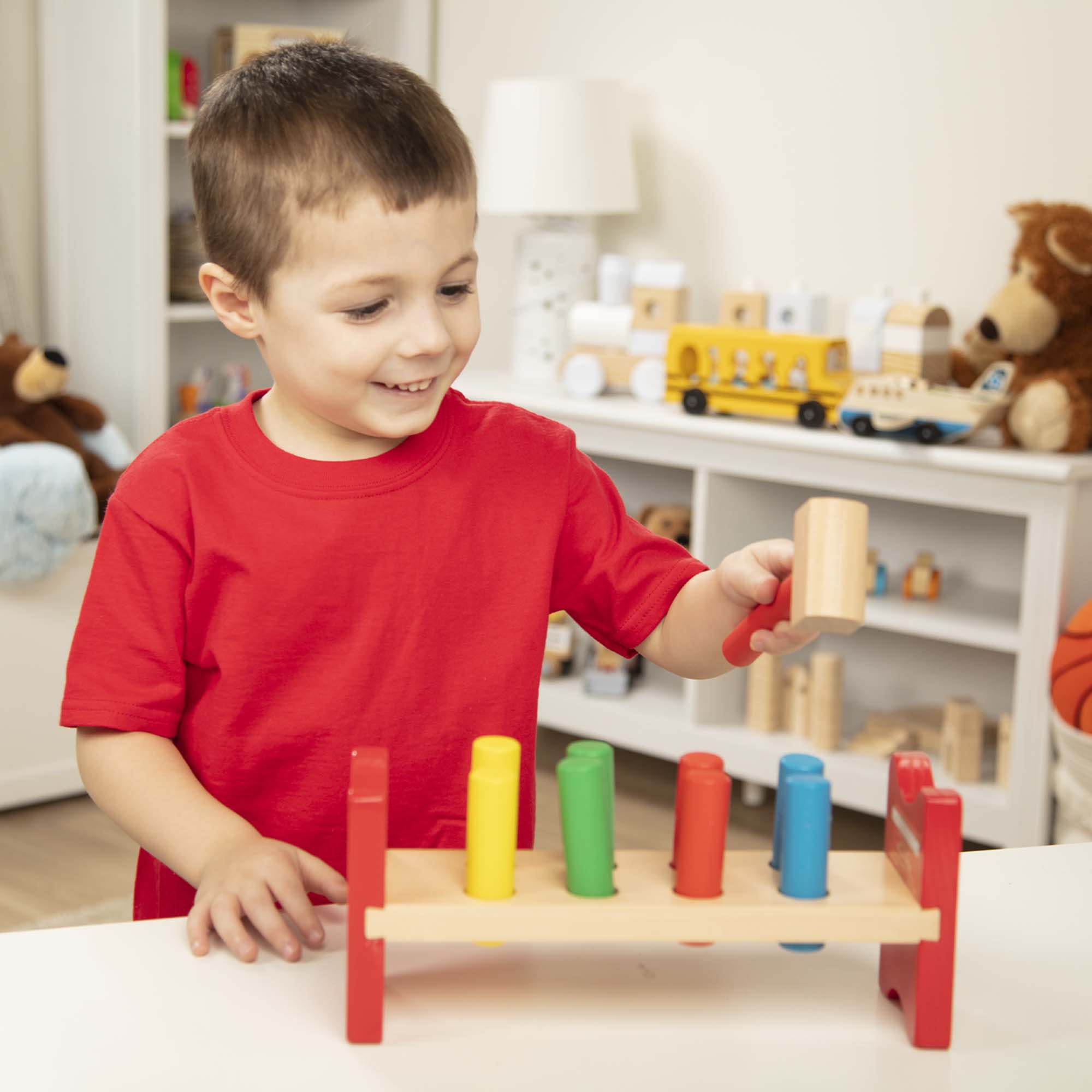 Pound the eight colorful wooden pegs into the wooden frame. then flip it over to repeat the activity again and again! Included are a wooden hammer and four pairs of pegs–great for color matching. This product is certified by the Forest Stewardship Council. FSC certification ensures that products come from responsibly managed forests that provide environmental. social. and economic benefits. and that forests are protected for future generations. Please note that FSC certification applies to new inventory only (FSC C156584)