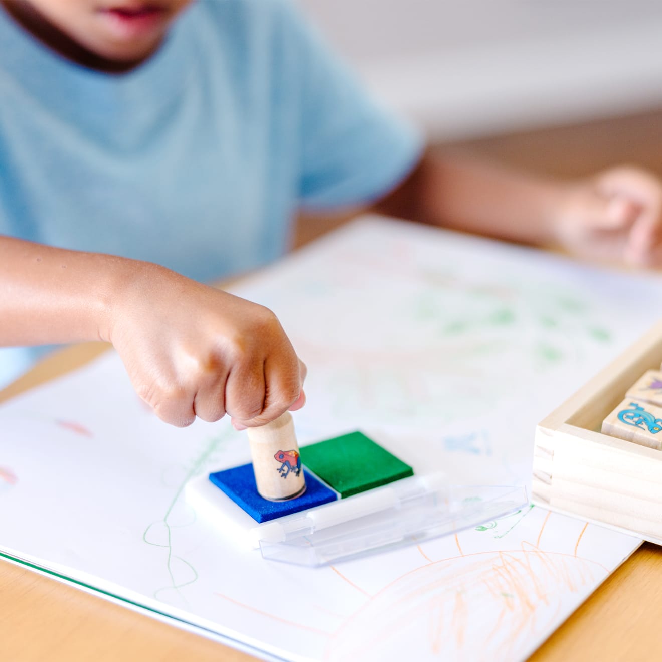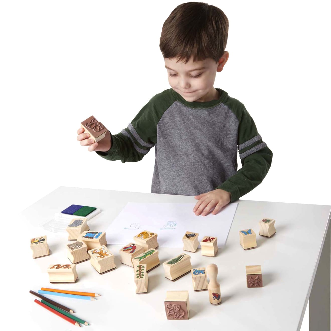Monkeys. snakes. birds and bugs galore combine to create a jungle straight out of your imagination! This extra-large stamp set for kids makes it easy to create an exciting storyline or a color-in scene: It includes 20 rubber-faced. wooden-handled outline stamps and a two-color stamp pad filled with blue and green washable ink. Five colored pencils coordinate with the jungle theme to add details and color in the scene. It’s a complete arts & crafts activity and storytelling kit in one!