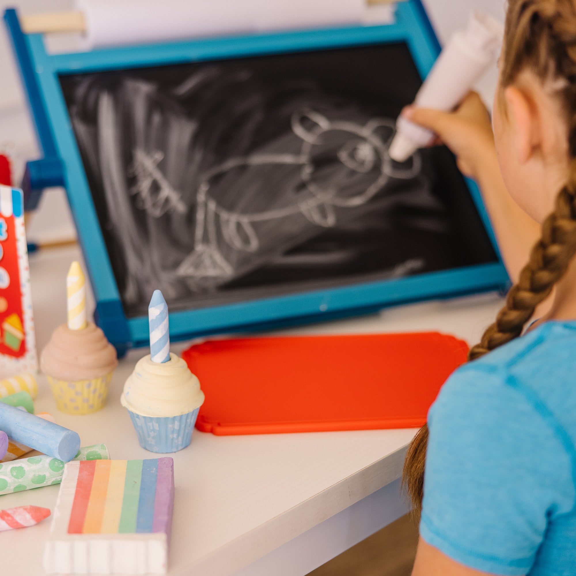 Create countless scenes with colorful chalk in sweet dessert shapes! Draw. trace. and stamp chalk designs with chalk cupcakes. cookies. birthday candles. frosting. donut. jumbo sticks. and more! The vibrant colors in this deliciously adorable 33-piece play set are perfect for drawing on the included sign with holder. sidewalks. driveways. or chalkboards. Trace shapes on three extra-thick stencil sheets or make quick and easy rainbow lines with the multi-colored slice of cake! Add water to the sprinkle stamper to make chalk paint polka-dots. There’s a menu of drawing and game ideas to help jumpstart imaginations—the possibilities are endless! Kids three and older will love creating sweet chalk designs again and again!