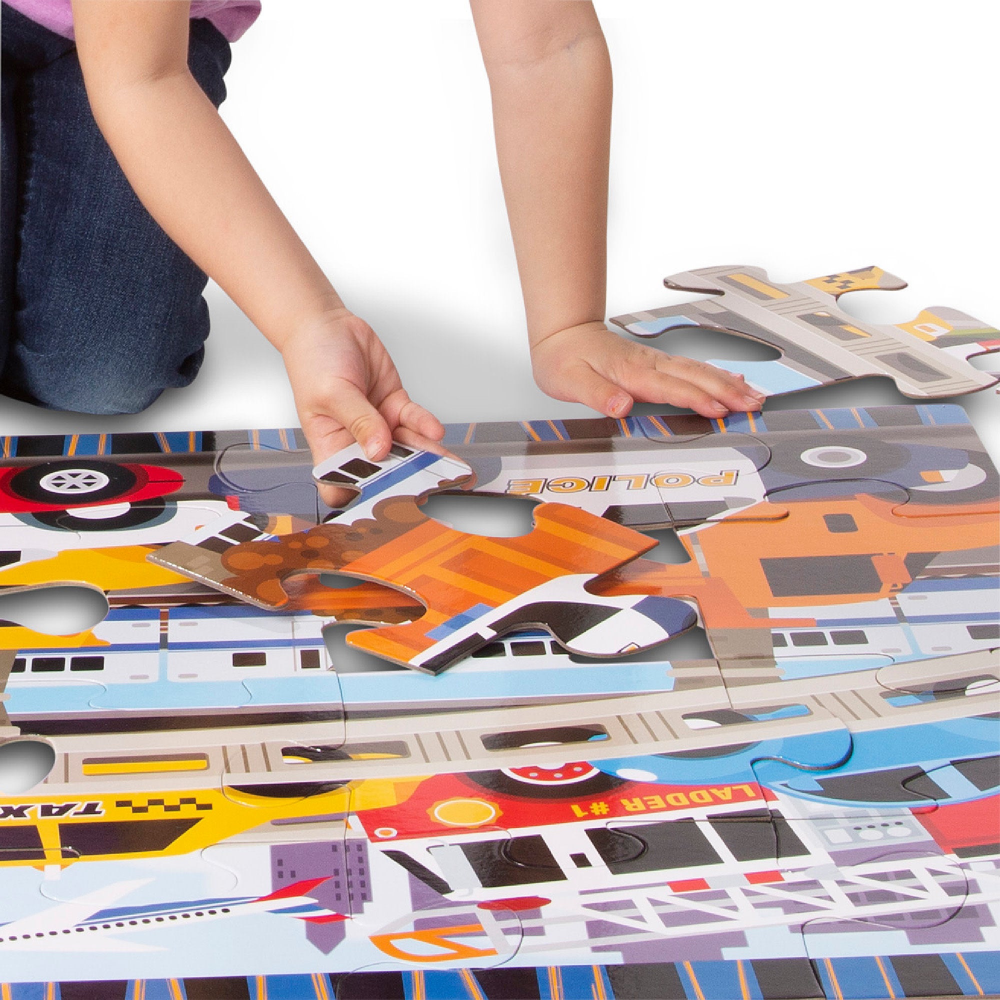 Beep beep! With so many vehicles to identify. no one would mind sitting in this traffic jam! This large floor puzzle features brightly colored vehicles that kids can recognize such as a cement truck. a taxi. a police car. and even a plane and a train in this multi-vehicle scene. While playing with this Traffic Jam Puzzle. kids ages three and older can practice shape recognition. hand-eye coordination. and problem-solving skills. And they’ll have loads of fun while doing it! They might recognize some of their favorite vehicles that can inspire them for storytelling and other imaginative play. The puzzle includes 24 jumbo pieces made out of durable. extra-thick cardboard. Once the puzzle is completed and set up. it measures 36 inches x 24 inches fully assembled. Don’t worry about your kids playing with the floor puzzle over and over again??the puzzle pieces are not just durable. they’re made with an easy to clean surface that helps to keep it looking like new. The Traffic Jam Floor Puzzle makes an exceptional birthday gift or holiday gift for kids ages three and older. This product is certified by the Forest Stewardship Council. FSC certification ensures that products come from responsibly managed forests that provide environmental. social. and economic benefits. and that forests are protected for future generations. Please note that FSC certification applies to new inventory only (FSC C156584).