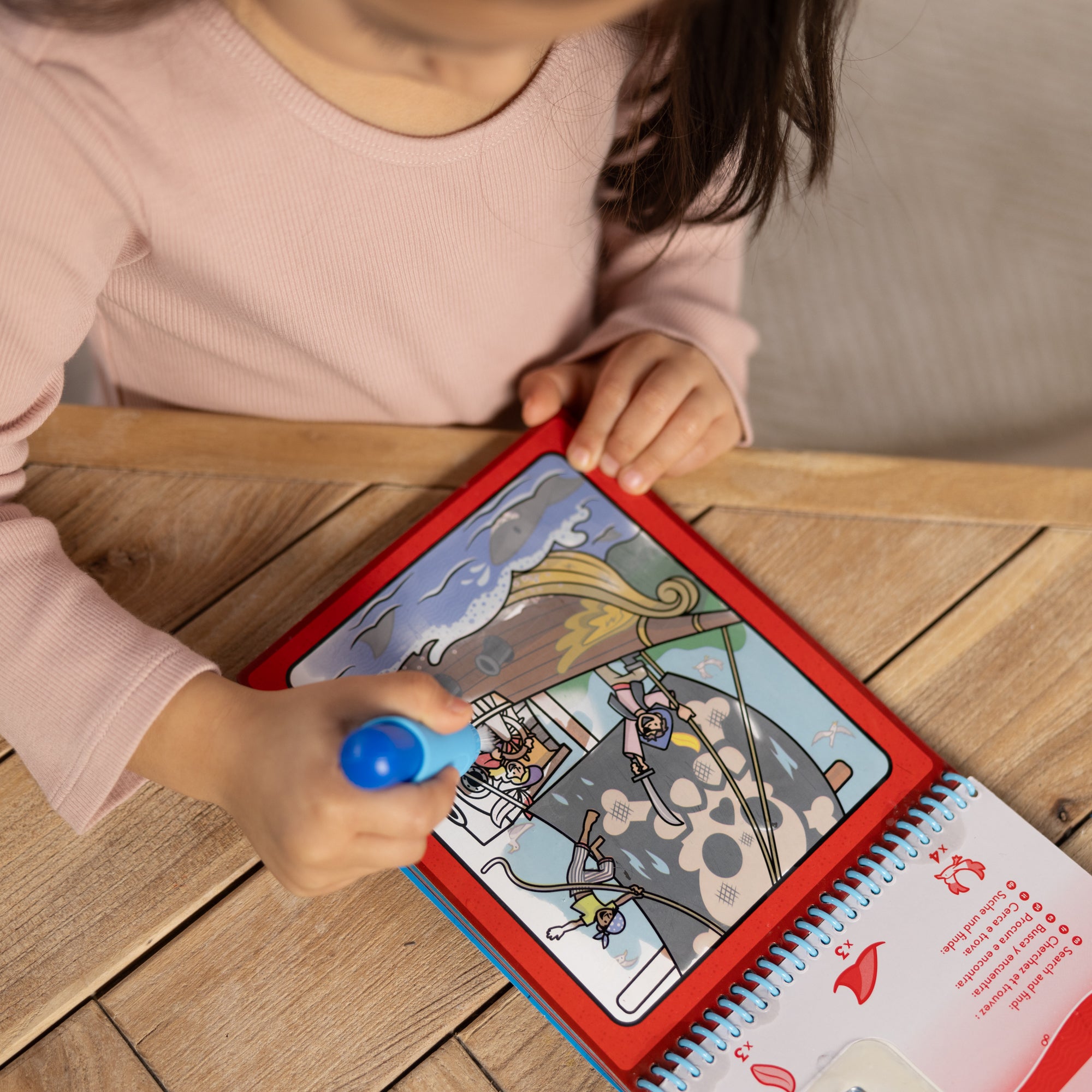 Triple the fun with this three-pack of exciting and reusable Melissa & Doug Water Wow! activity pads. Each pad (Dinosaur. Adventure. and Space) includes four reusable Water Wow! boards. Pages in the spiral-bound pads are white when dry. and reveal colors. pictures. and shapes when wet. Let the pages dry to erase. then color with water again and again! Search-and-find activities and fun facts are included with each scene. The chunky-sized water pen (one with each pad) is easy to fill. easy for small hands to grasp. and stores in the activity pad ?C making these terrific travel toys.