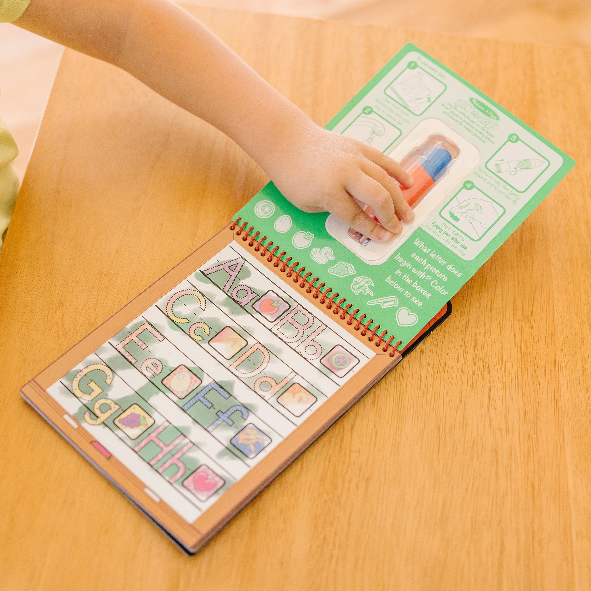 This exciting activity book includes four reusable pages and a refillable water pen. Use the pen to fill in each activity. from coloring in boxes to tracing letters. and see hidden colors and pictures appear with every stroke! Then simply let the page dry to erase the pictures and fill it in again and again. This alphabet-themed book includes every letter of the alphabet (uppercase and lowercase) to trace. alongside pictures of familiar objects to illustrate each sound. There are empty lines for practice. too! The chunky-sized water pen is easy for kids to hold and stores neatly right in the front cover. This product is certified by the Forest Stewardship Council. FSC certification ensures that products come from responsibly managed forests that provide environmental. social. and economic benefits. and that forests are protected for future generations. Please note that FSC certification applies to new inventory only (FSC C156584)