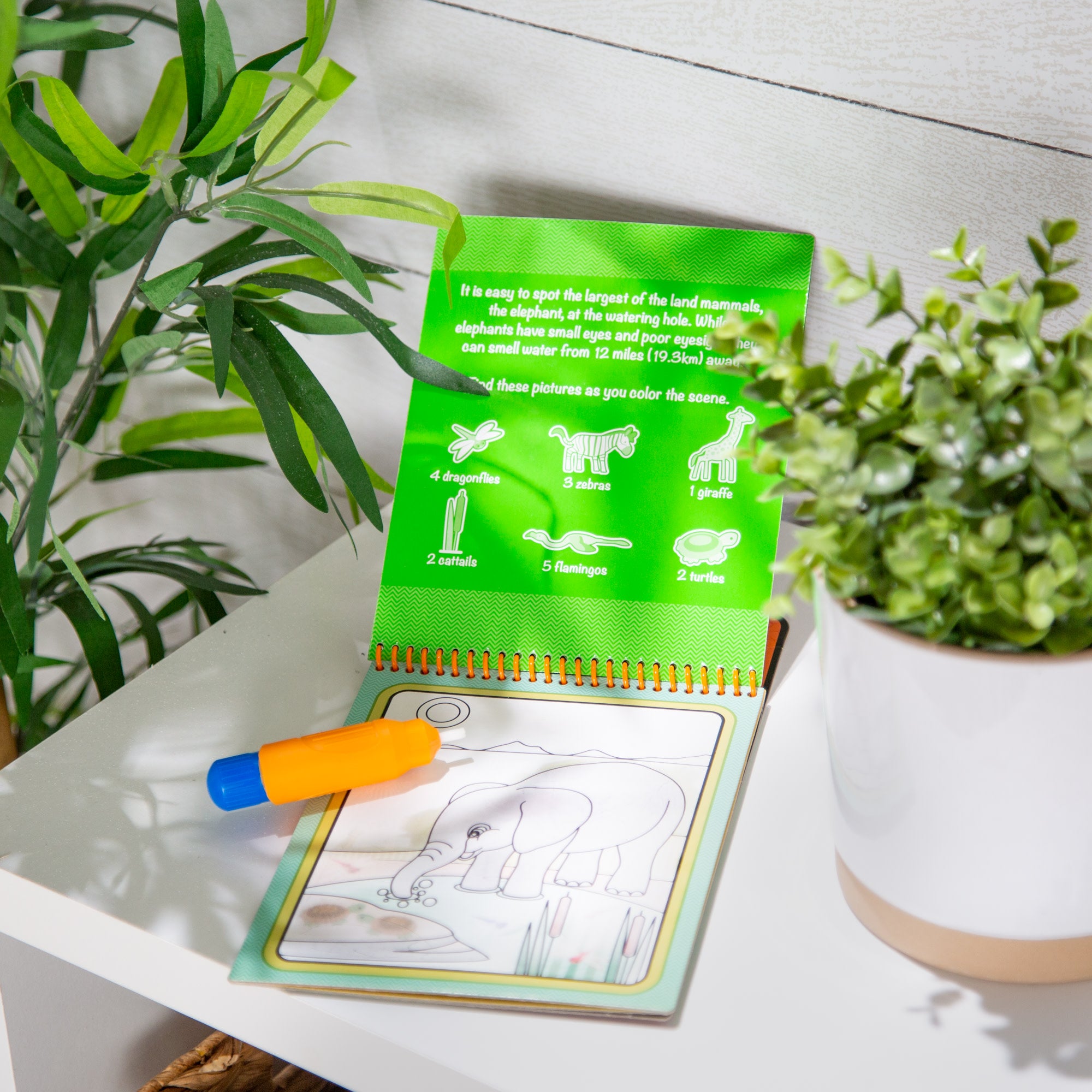 No-mess painting for kids! This exciting paint-with-water coloring book includes four reusable pages and a refillable water pen. Simply use the pen to color in each scene–details and vibrant color appear with every stroke! Then let the page dry to erase the pictures and fill it in again and again. This safari-themed book includes four scenes to color. and a search-and-find activity for each scene. The chunky-sized water pen is easy for kids to hold and stores neatly right in the front cover. so Water WOW! books make ideal travel activity books and travel toys for kids. This product is certified by the Forest Stewardship Council. FSC certification ensures that products come from responsibly managed forests that provide environmental. social. and economic benefits. and that forests are protected for future generations. Please note that FSC certification applies to new inventory only (FSC C156584)