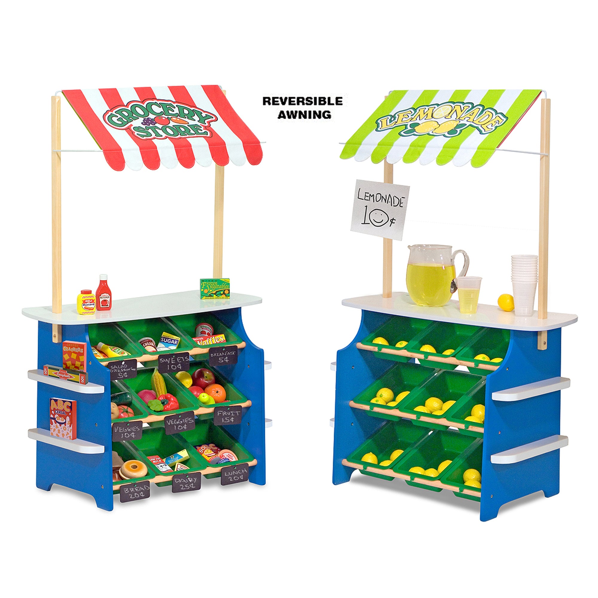 Whatever the season or weather. this wooden play center has the shop for you! The Melissa & Doug Grocery Store/Lemonade Stand is a double-duty wooden playset for kids. It serves as a grocery store or a lemonade stand with a simple flip of the awning. The playset includes nine portable plastic bins for pretend shopping or for storing pretend groceries. nine removable chalkboard signs. a spacious countertop. and a reversible fabric awning. Kids can let customers know they’re open for business as a Grocery Store or as a Lemonade Stand. depending on which side of the awning they choose. The stand features side shelves to display items for sale or daily specials. Designed for easy assembly and made from durable. high-quality wood. the playstand is an exceptional value. It makes a great gift for kids ages three and older for hands-on. screen-free play. We make well-crafted toys that are developed with care to be passed down from generation to generation or shared family to family. When kids pretend with Melissa & Doug. anything is possible!