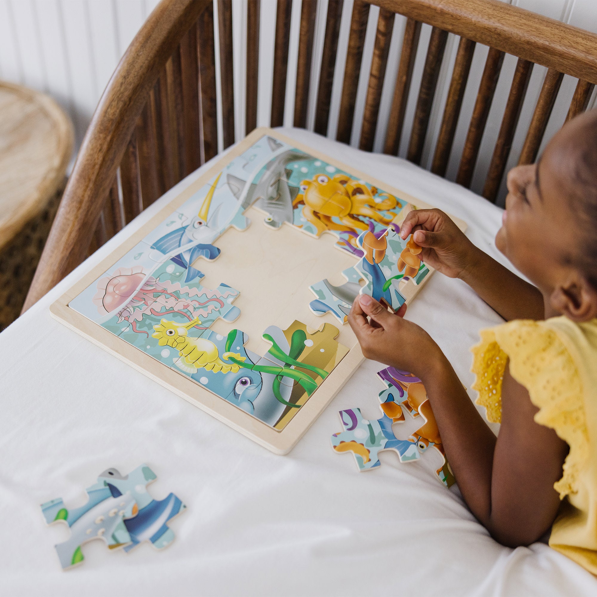 From sea star to jellyfish. this 24-piece wooden jigsaw puzzle is filled with colorful ocean life! Discover the wonders of the deep blue sea by assembling this fascinating underwater scene. This colorful kids’ puzzle comes packaged in a sturdy wooden tray. providing a stable play surface and easy storage.